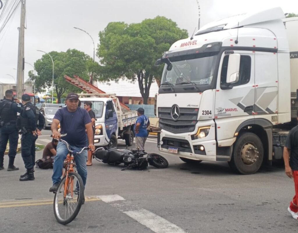 Acidente entre carreta e motocicleta deixa mulher ferida no cruzamento da Rio Branco com Leste-Oeste em Mossoró